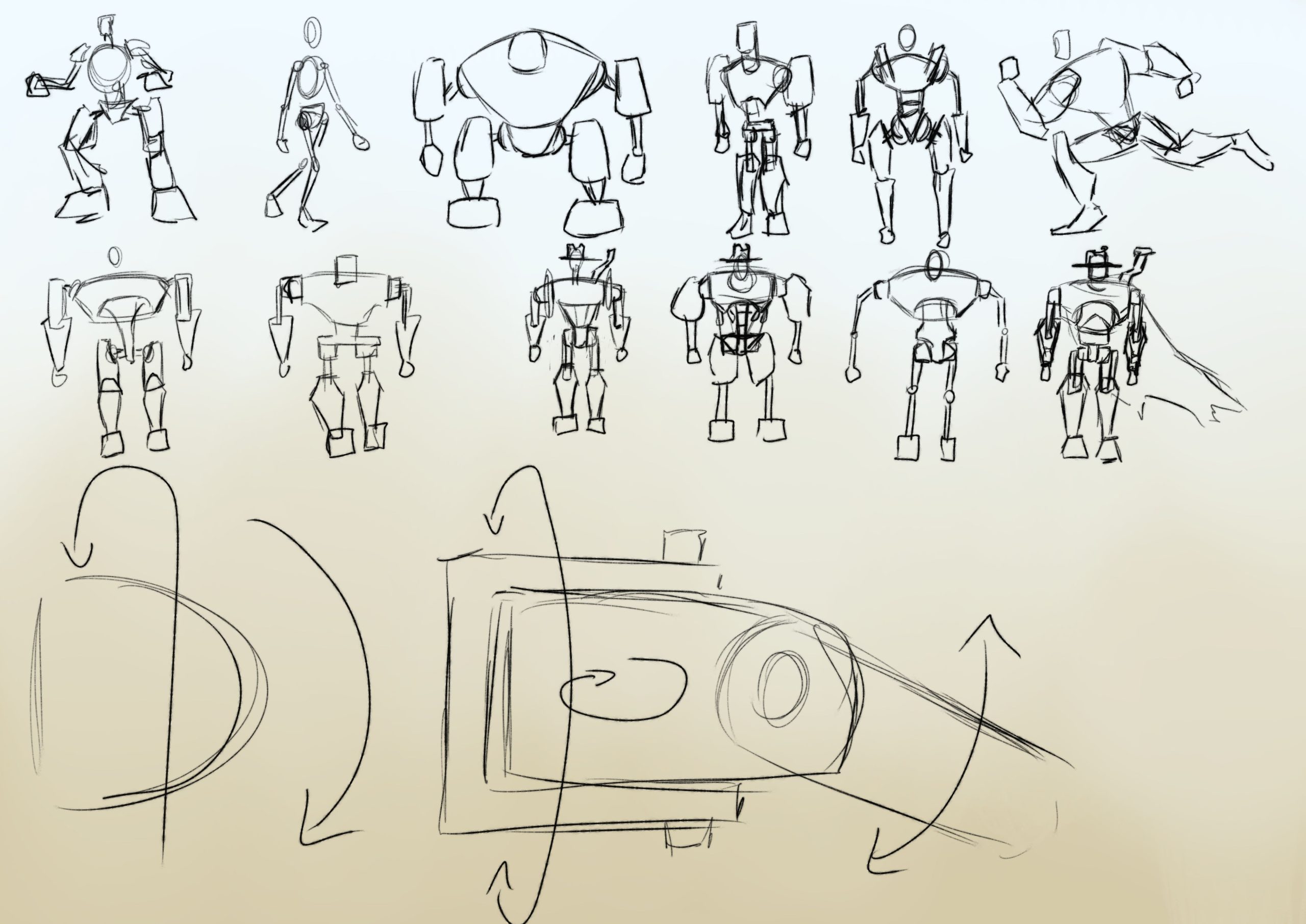 My first sketches tried to nail down whether Deputy Rusty would be bulky or skinny. Through this process, I gained another point of inspiration. Growing up I was obsessed with legos, especially Bionicles. With my favorite childhood toys as a reference, I ended up landing on a design that was very blocky, but not too bulky.