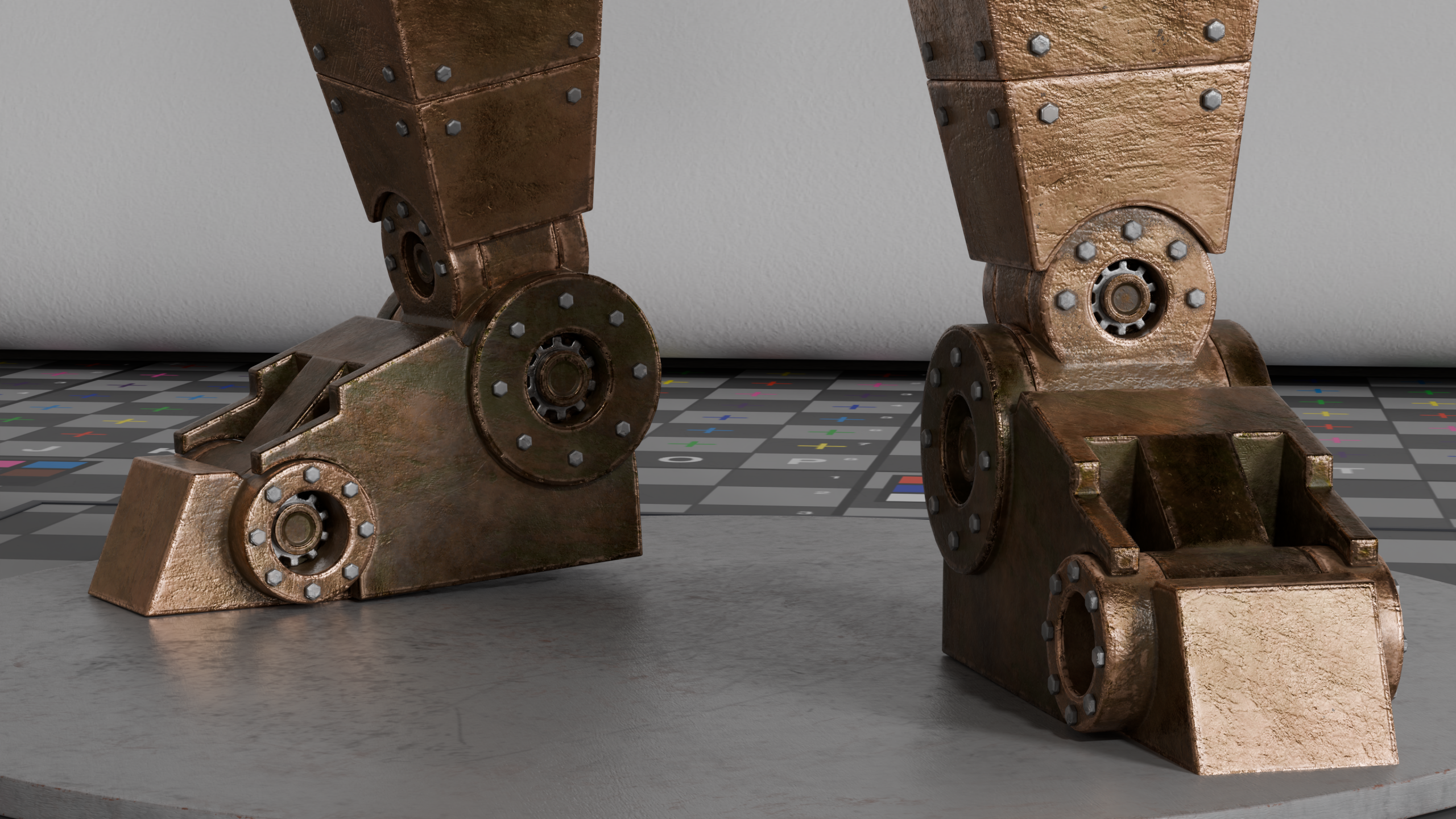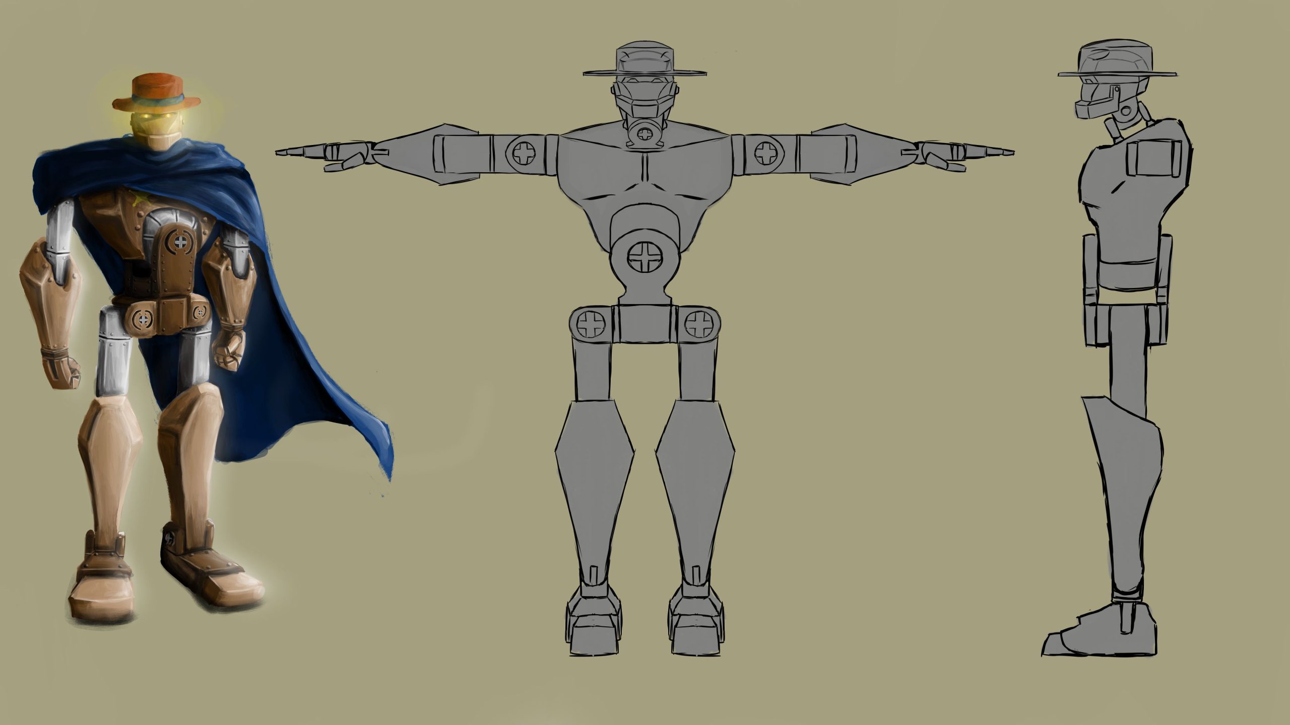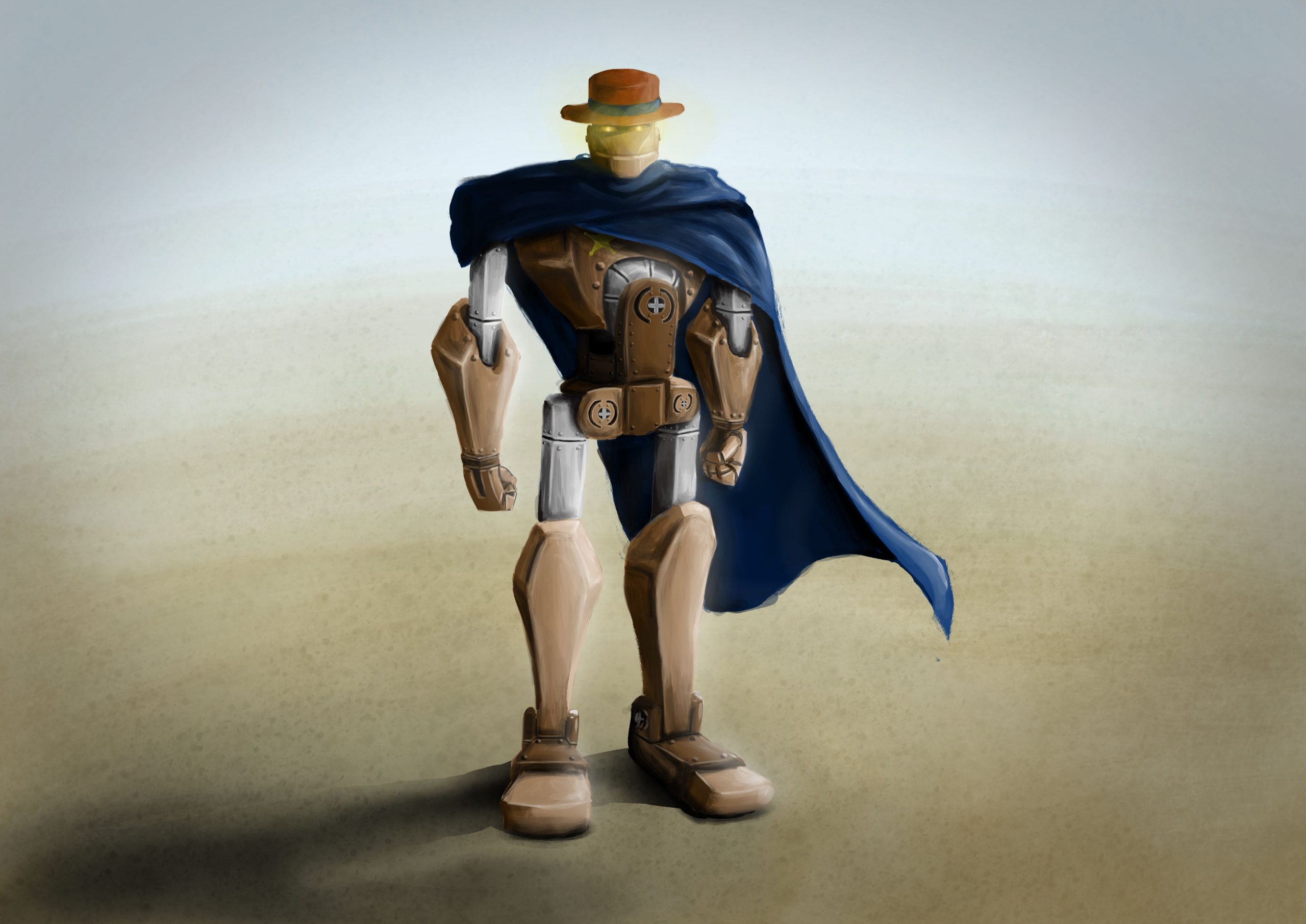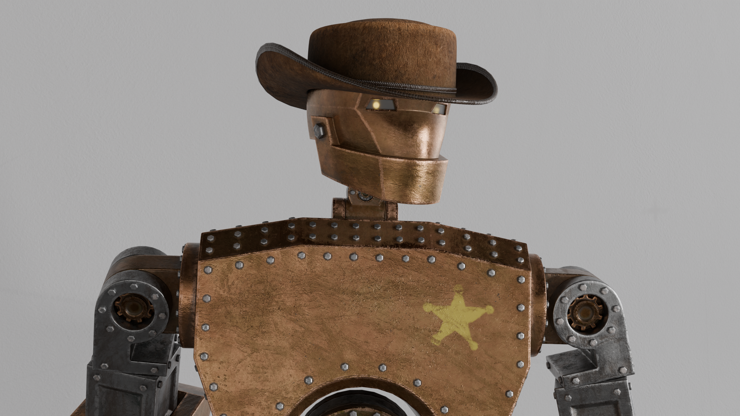 I desired the Deputy Rusty’s textures to tell a story. So, who is Deputy Rusty? Well, without spoiling too much (since I plan on using this character in future projects) Deputy Rusty, despite his name, is actually in quite a good condition. Living in the harsh conditions of the old west has caused some wear and tear to his metal body, but largely he is undamaged and uncorroded. Specifically, with the undamaged part, this means to me that he can and has taken a few hits and walked them off. This toughness and this ability to be an impenetrable wall is what earned him the title of Deputy. The hand-painted star on his chest and his cowboy hat were both gifts from grateful townsfolk. In my mind, this relationship of trust is what gives Deputy Rusty a sense of character.