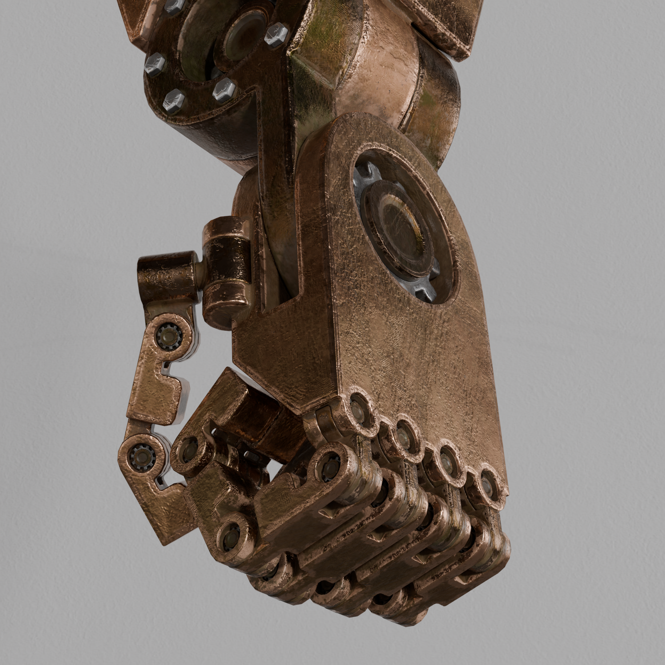 In this animation test I wanted to see how the parts interacted in motion. The way I designed the joints meant that no joint rotated on more than one axis, so areas of complex movement such as the wrist were broken up into multiple cascading joints. This created another deviation from my original concept art.