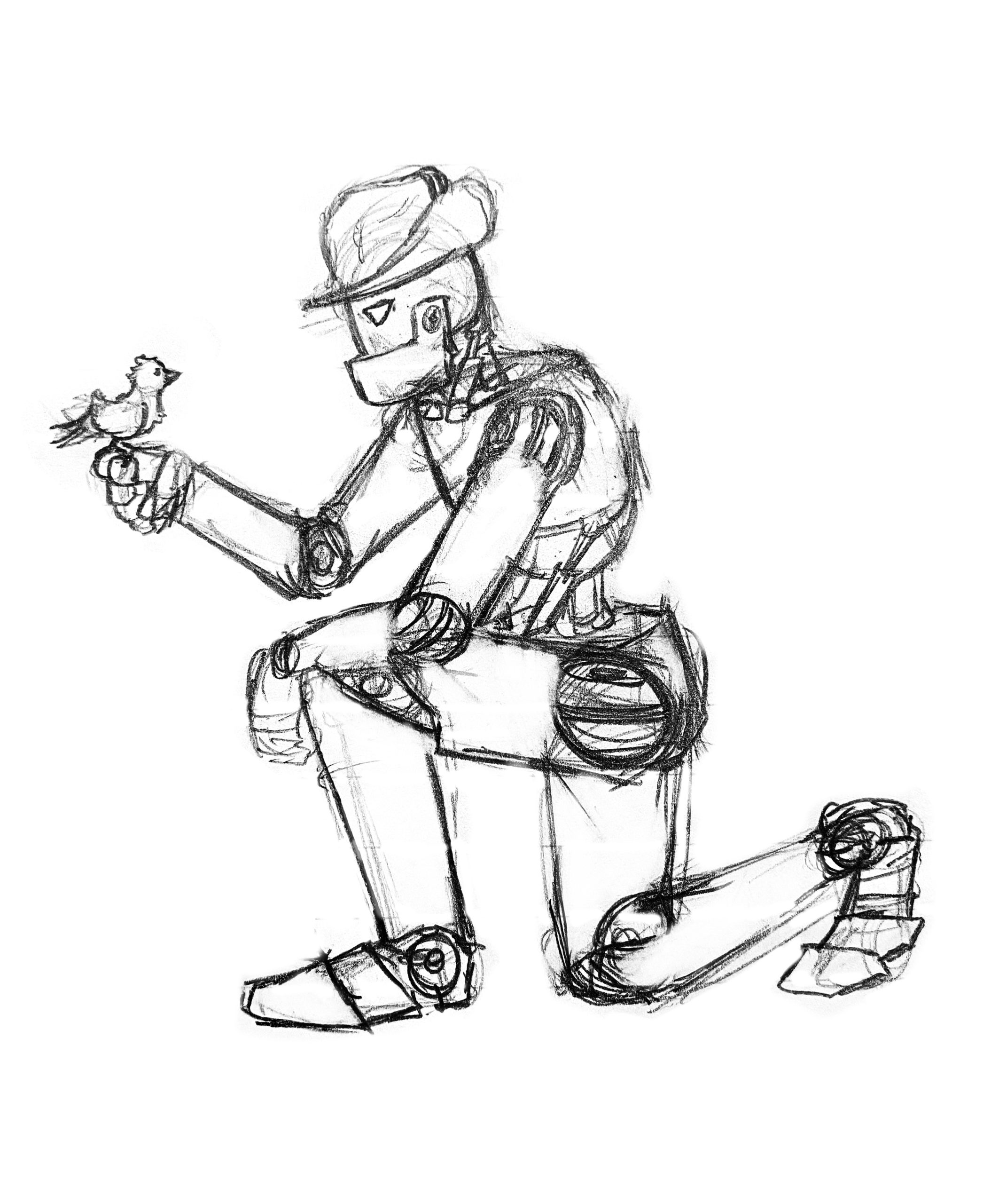 This was my first sketch of Deputy Rusty. From the beginning, the fundamental trait of a robot wearing a cowboy hat was established. Some character traits were also cemented here, such as Rusty being kind and gentle, as seen by him gingerly holding a bird.